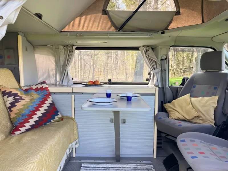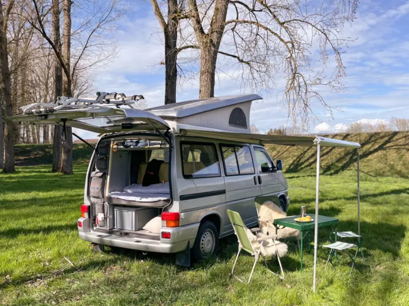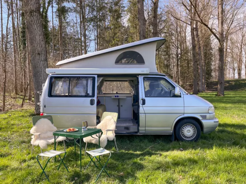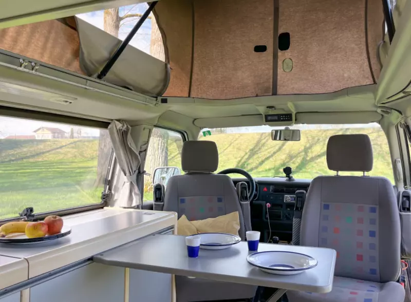 Küchenschrank mit zwei Gaskochfeldern und Spüle Drehbare Fahrer- und Beifahrersitze Demontierbarer Tisch, einhängbar zwischen Sitzbank und Fahrersitz Campingtisch und Campingstühle für vier Personen Geschirr, Besteck und Schüsseln für vier Personen Kaffeekocher, Pfannen und Töpfe Starter- und Wohnbatterie mit Energie für mehrere Tage Aussensteckdose für Stromanschluss auf Campingplätzen Auffahrkeile mit verschiedenen Höhen
