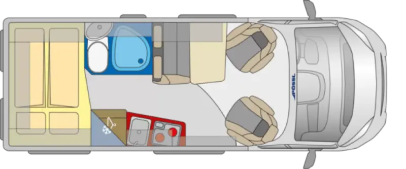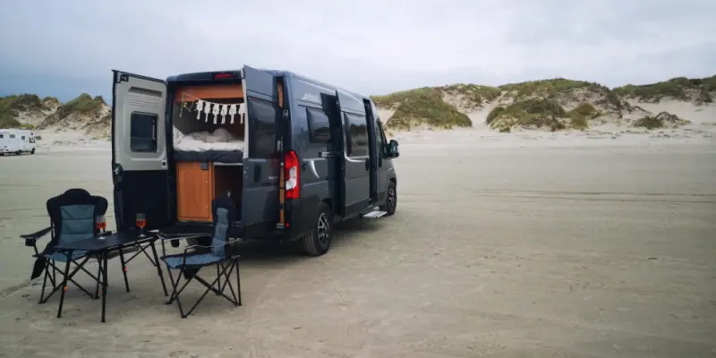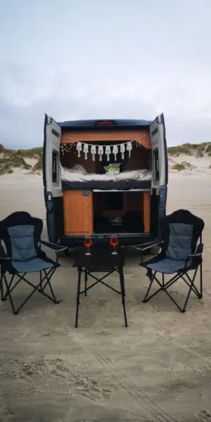 Unser Free Willy macht seit Oktober 2024 die Straßen unsicher und hat alles an Bord was man für ein Roadtrip braucht. Der Wohnbereich punktet mit dem ausziehbarem Tisch, einer Doppelbank und den beiden drehbaren Vordersitzen. Der Küchenbereich besteht aus einem Doppelkochfeld für Gas, einer Spüle, einem Kühlschrank mit kleinem Gefrierfach und viel Stauraum. Der Kühlschrank wird im Stand über Gas oder 220 V Landstrom betrieben, während der Fahrt läuft er über die Batterie. Das Bad bietet eine Toilette, Dusche und ein kleines Waschbecken. Auch hier ist genügend Stauraum für alles was man unterwegs braucht. Der Schlafbereich bietet drei große Staufächer und ein Schlafplatz von ca 2m x 1,5 m. Die Gasanlage verfügt über zwei 11kg Gasflaschen mit einer automatischen Flaschenumschaltung. Der Frischwassertank fasst 100l, der Abwassertank 92l. Dank der Truma Heizung stehen einem nach Bedarf 10l heißes Wasser zu Verfügung. Außerdem kann man die Standheizung auf eine beliebige Temperatur einstellen. Alle Fenster verfügen über Mückennetze und Verdunklung. USB Anschlüsse sind sechs vorhanden und können jederzeit über die Camper Batterie benutzt werden. Alle 220V Steckdosen sind nur über Landstrom nutzbar. Im Preis inbegriffen sind 200km pro Tag. Jeder weitere Kilometer wird mit 38 Cent nachberechnet. Stromkabel, Auffahrkeile, Faltkanister, Toilettenzusatz, Küchenset (Teller, Schälchen, Becher, Kochtöpfe, Salatschüssel, Kaffekocher, Besteck) und Abschleppseil liegen für euch im Van bereit. Optional bieten wir einen Campingtisch mit zwei Stühlen gegen einen Aufpreis von 15€ an.