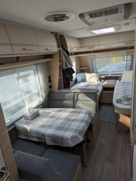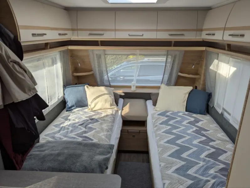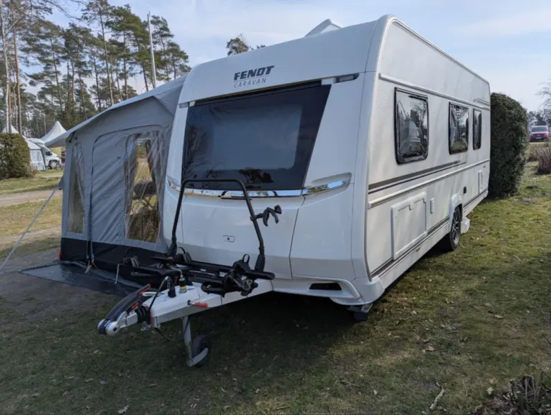 Herzlich Willkommen, der nagelneue Wohnwagen bietet Platz für 2 Erwachsene und 2 Kinder bis 70kg. Die Schlafplätze sind 2 Einzelbetten (Front) erweiterbar zu großer Liegefläche und 2 Hochbetten(Heck). Als Sonderausstattung verbaut sind: - Klimaanlage - Mover (rangieren per Fernbedienung) - Autark-Paket für 12V Verbraucher. - Smart TV Der Wohnwagen hat eine zulässige Gesamtmasse von 2000kg. Eine Tempo 100 km/h Zulassung ist vorhanden. Sollten Sie sich nicht in der Lage fühlen den Wohnwagen zu ziehen, bieten wir auch einen "Hol- und Bring Service" im Raum Schleswig-Holstein an. Wir haben den Wohnwagen vollbeladen mit allem Zubehör gewogen =1840kg. - Das heißt, Sie haben die Möglichkeit noch 160kg an persönlichen Gegenständen mitzunehmen. Hunde können Sie auf Ihrer Reise begleiten. Komplett ausgestatteter Wohnwagen mit der Möglichkeit verschiedene Pakete dazu zu buchen unter anderem: - Napoleon Gasgrill inkl. 5kg Gasflasche mit 2 Brennern - Luftvorzelt volleinzug von Dometic 2025 - Sonnenluftvorzelt 4m breit und Seitenwänden von Dometic 2025 - Thule Superb Fahrradträger für 2 E-Bikes auf der Deichsel montiert Tagesmiete zur Hauptsaison 99€ Mai-September *Neu* Ab 14 Tagen Buchungszeitraum 200€ Rabatt=85€ Tagesmiete zur Nebensaison 90€ Oktober-April *Neu* Ab 14 Tagen Buchungszeitraum 200€ Rabatt=76€ Das Buchungsportal und alle weiteren Informationen finden Sie auf unserer Internetseite: www.camper-jess.de Wir freuen uns auf Ihre unverbindliche Anfrage
