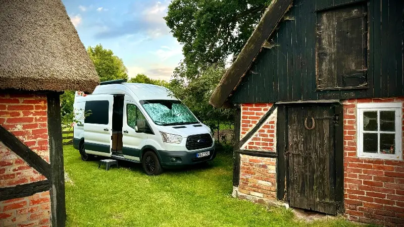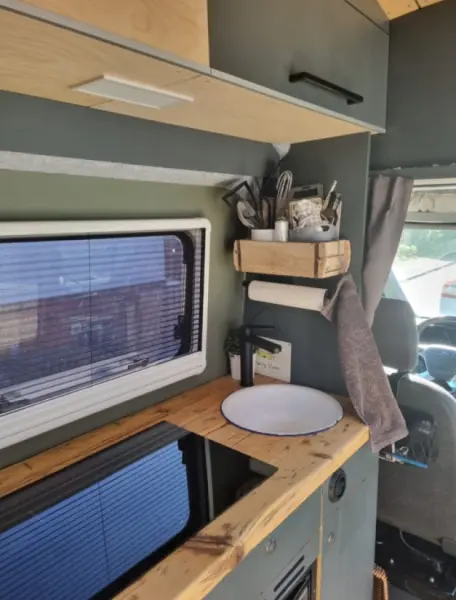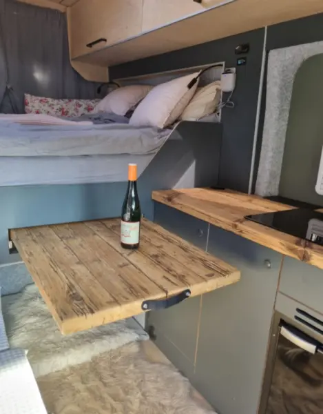 Der Camper hat 2 Schlafplätze mit einer Liegefläche von 1,90cm und einer Breite von 140cm. Er hat viel Stauraum und bietet genug Platz, um auch Fellnasen mitzunehmen. Er hat eine Chemietoilette, ein Waschbecken mit Frisch- und Abwasser (jeweils 20 Liter),ein Induktionskochfeld und einen mobilen Campingkocher an Bord. Dank Solar auf dem Dach kann man auch ein paar Tage autark stehen, ohne dass man auf kühle Getränke verzichten muss, da auch ein Kühlschrank mit Frostfach vorhanden ist. Ein Ausziehtisch ist unter dem Bett verbaut, damit man auch bei schlechtem Wetter gemütlich frühstücken kann. Außerdem findet Ihr folgendes vor: - Auffahrkeile -Scheibenverdunklung für Frontscheibe -Verdunklungsvorhang zum zuziehen Richtung Fahrerraum -Geschirr und Kochutensilien (Töpfe, Gläser, Becher, Schüsseln etc.) -Standheizung mit Lüftung über Dieselmotor -Autotherm Comfort Control Air 2D mit Bedienteil - kleiner Ventilator -Tablethalter am Bett ( Tablet muss selbst mitgebracht werden für evtl. Fernsehabende) -2 Stühle mit Tisch -Markise Bettwäsche, Bettzeug und Handtücher bitte selber mitbringen:) Persönliche Dinge einladen und los geht die nächste Reise. Einfach Spaß haben und genießen!