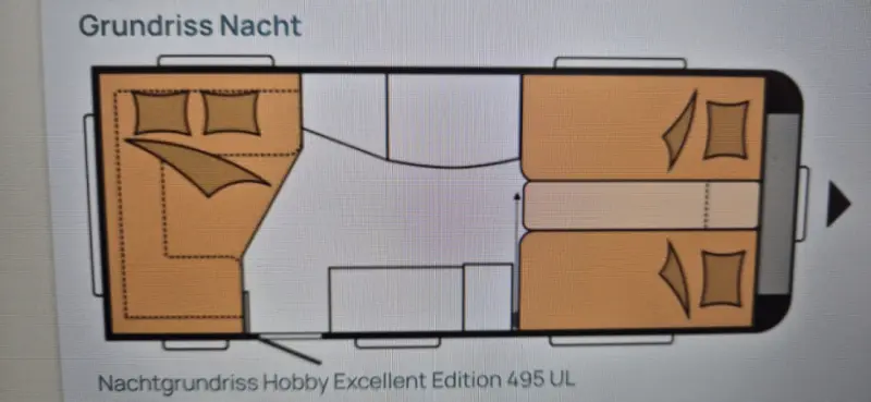 -Festbett 140x200 hinten (die Sitzgruppe wurde umgebaut) -Stockbett vorne links -Sitzgruppe vorne rechts kann in ein zusätzliches Kinderbett umgebaut werden
