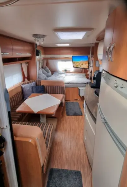 Der Wohnwagen für die ganze Familie bietet ausreichend Platz für bis zu sechs Schlafplätze. Wir möchten unseren Hobby 545 KMF mit euch teilen! Es ist ein geräumiger Wohnwagen mit 2 Etagenbetten und großem Doppelbett, perfekt für Familien. Bei Bedarf kann auch die Sitzecke zum Bett umgebaut werden für weitere 2 Personen. An Bord ist alles, was das Campen angenehm macht. Für den Wohnwagen benötigt ihr einen Anhänger-Führerschein (BE oder B96). Sollten Sie keinen passenden Führerschein haben kein Problem, wir bieten Ihnen auch einen Bring- und Holservice gegen eine Gebühr an , so wie einen Aufbauservice. Der Wohnwagen ist 2,50m breit und bietet ordentlich Platz im Innenraum. Zum einfachen Rangieren ist ein Mover verbaut, mit dem man den Wohnwagen per Fernbedienung auf dem Campingplatz ganz einfach manövrieren kann. - Typ: Hobby 545 KMF - 100 Km/h Zulassung - Leergewicht: ca. 1.250Kg - zul. Gesamtgewicht: 1.750Kg - Fahrzeuggesamtlänge: 7530mm - Fahrzeuggesamtbreite: 2500mm - Fahrzeuggesamthöhe: 2600mm - Antischlingerkupplung, ATC -ALKO Trailer Control, Anti-Schlinger-System (elektronische Zusatzbremse) - 2-fach Fahrradträger Deichsel Ausstattung Wohnwagen: - Sonnensegel - CEE Stecker - Verlängerungskabel - Gaskasten mit 1 x 11 KG Gasflaschen, Gasflasche auf Wunsch dabei , wird nach Verbrauch abgerechnet ( je angefangene 1 kg = 2,80 Euro ) - Schlafplätze: 6 Personen - Sitzgruppe: Große Rundsitzgruppe - optional auch zum Bett Umbau möglich - Betten: 1,40 x 2,00m - Betten: 2er Etagenbett 1,90x0,70 cm - 1 Fernseher + vollautomatische Satanlage - Frischwassertank von außen befüll bar - Citywasseranschluss - Eingangstür mit Fliegenschutz - WC-Toilette mit Waschbecken, Spiegel und Dachluke - seperate Duschkabine - Fenster ausstellbar , sowie mit Verdunklung und Fliegengitter ausgestattet - Staukasten Klimaanlage - Heizlüfter über Strom - großer Kühlschrank mit Gefrierfach (12V/230V und Gas) - Küchenutensilien, Geschirr, Besteck, Töpfe, Pfanne uvm - Toaster - Wasserkocher - Heizung mit Warmluftanlage (Gas und 230V) - Feuerlöscher - Warmwasser - 3-fach Gaskocher - Schlafbereiche Trennbar mit Raumtrenner - viele Staufächer - Vorzeltleuchte - Stützlastwaage - umfangreiches Campingzubehör vorhanden (Besteck, Geschirr, Töpfe, Schüsseln ect.) - ein paar universal Außenspiegel für das Zugfahrzeug - Nässeschutz für die Matratzen- keine Bettlaken und Bettwäsche - Sitzbank und Tisch für draußen - bisschen was zum spielen - Handseife, Spülmittel, Müllbeutel - 3x Regenponchos, 2x Regenschirme Gegen Aufpreis können zur Verfügung gestellt werden: - Luftvorzelt für einen schnellen und unkomplizierten Aufbau - Mikrowelle - ein weiteren Kühlschrank für das Vorzelt - Handtuch-Set - Betten Set inkl Bettwäsche und Bettlaken - Gasgrill - 4 Stühle mit verstellbarer Rückenlehne - Außenmöbel - Spülmaschine ( Aufbau im Vorzelt) - E- Scooter mit Straßenzulassung+ Handyhalterung - F2 Stand Up Paddel, 150 kg zulässiges Gesamtgewicht, Luftpumpe