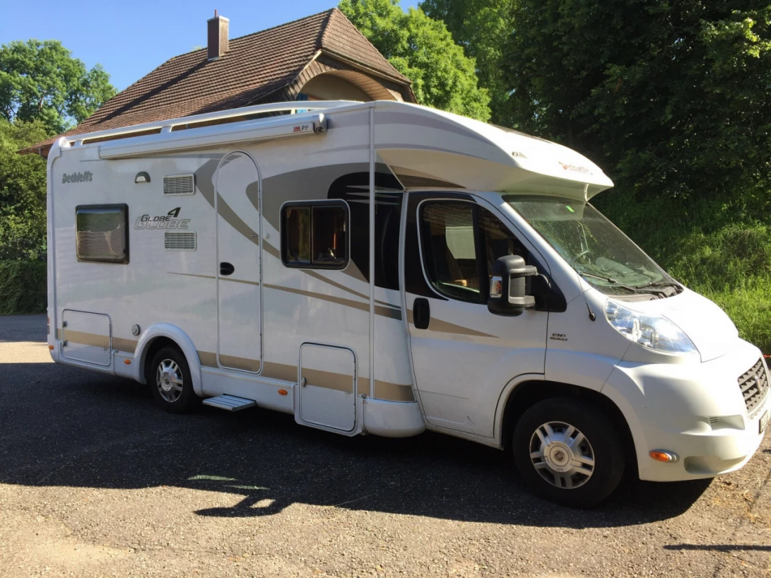 Gepflegtes Nichtraucher-Wohnmobil mit 4 Reiseplätzen und bis zu 5 Schlafplätzen. Lassen Sie sich vom teilintegrierten Globe 4 verführen. Hubbett über der Sitzgruppe, maximaler Wohnkomfort und zusätzlichen Schlafplatz. Hubbett, Sitzgruppenbett und Küche sind so angeordnet, dass diese gleichzeitig genutzt werden können. Das Fahrzeug ist komplett ausgerüstet...., CD, Besteck, Teller, Becher, Pfannen, weitere Küchenutensilien, WC-Chemie, Dusche. Fahrradträger bis 4 Fahrräder usw. Tiere sind nach Absprache erlaubt!