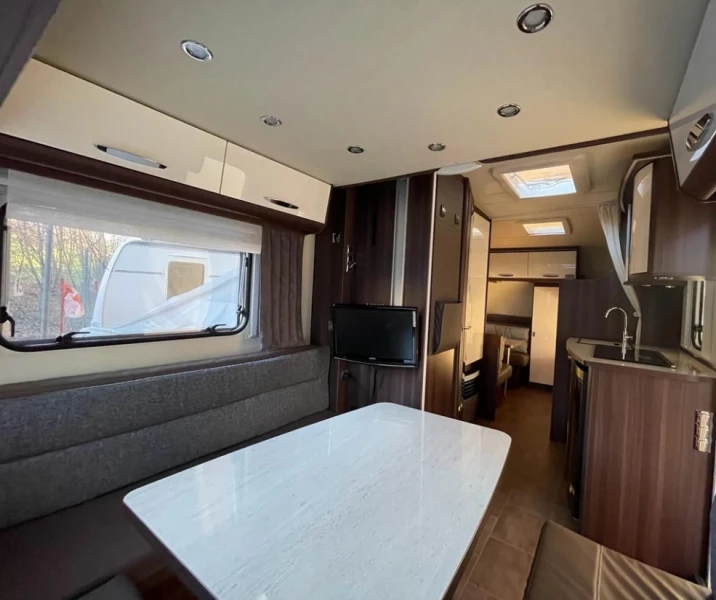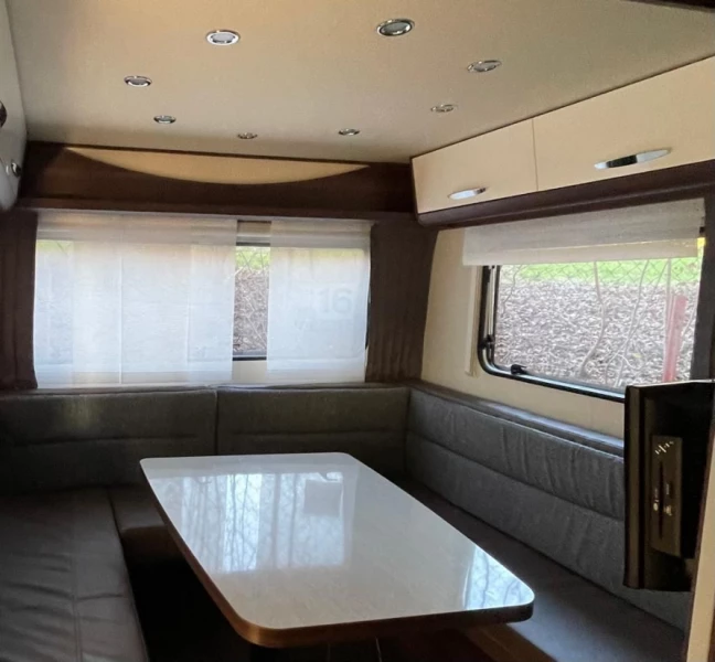 Se originaltekstSmuk familievogn, ideel til en familie på fem. Har en dobbelt sænkeseng og en spiseplads, der kan laves om til en ekstra dobbeltseng. Der er også en køjeseng og et ekstra lille siddeområde med et bord, der kan laves om til en tredje enkeltseng. Masser af opbevaringsplads til tøj osv. Der er inkluderet et opvarmet klædeskab med bøjlestang. Takket være gulvvarmen er vognen også fantastisk på køligere dage. Fuldt udstyret køkken med service og køkkenredskaber til op til syv personer. Badeværelset har kemisk toilet, vask og opbevaringsskab. Et cykelstativ til op til tre cykler er monteret på trækstangen. Anhængertrækket har en maksimal kuglevægt på 100 kg. En stor frontluge gør lastning nem. En markise kan tilføjes. To stole med fodstøtter, tre uden, fire almindelige stole og et stort bord kan fås efter anmodning. Sidespejle til trækkende køretøj kan fås efter behov. Vognvognen er udstyret med en mover for nem manøvrering i ujævnt terræn. Aircondition er inkluderet.