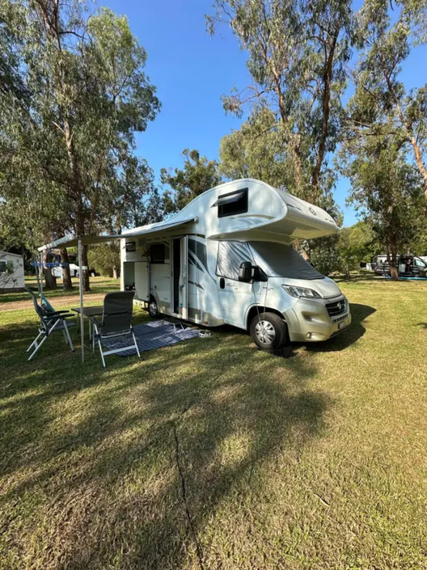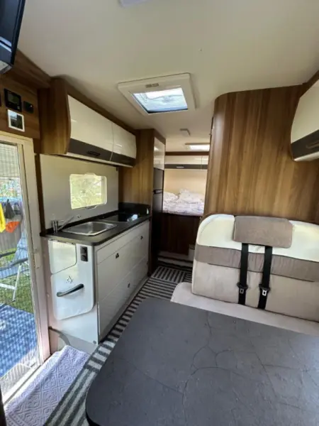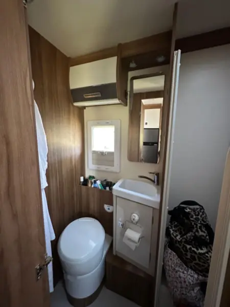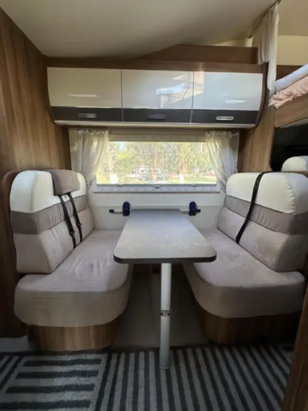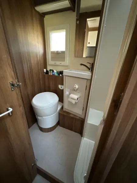 Vorne gibt es ein Vorzelt, das bei Wind und Regen geschützten Sitzplatz bietet. Dieses kann gegen Aufpreis genutzt werden.