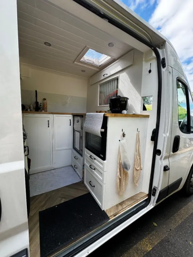 Oversæt med Google Translate🚐 Fourgon aménagé autonome, prêt à vivre et voyager en toute liberté Motorisation GNV + essence | Crit’Air 0 | VASP en cours Découvrez un fourgon conçu pour l’autonomie totale, le confort absolu, et la tranquillité d’esprit sur la route comme à l’arrêt. ⚡ Électricité 100 % autonome – 12V et 220V (EcoFlow) Prises 220V classiques + prises USB 12V disponibles partout dans le fourgon Autonomie exceptionnelle grâce à une batterie EcoFlow rechargeable : → En 20 minutes seulement : soit en roulant, soit via branchement secteur, soit avec le panneau solaire Autonomie réelle d’une semaine en été sans recharge Éclairage intérieur puissant comme à la maison, avec interrupteurs muraux Caméra de sécurité intérieure connectée directement aux services de sécurité 🔥 Chauffage & chauffe-eau 15L – Truma Combi Chauffage puissant à gaz pour l’eau et l’air ambiant Programmation à distance possible : → Choisissez votre température de retour ou activez la douche chaude avant d’arriver Confort optimal : chaleur constante et eau chaude disponible à tout moment 🚿 Eau & sanitaires 100 % autonomes Réservoir d’eau propre de 100 L Grand évier de maison encastré et dissimulé Douche dissimulée sous le plan de travail (60x60), avec pommeau de douche type maison et eau chaude Toilettes sèches à séparateur d’urine : → Récupération dans réservoirs accessibles depuis l’extérieur (pas besoin de les transporter) → Utilisation de sachets biodégradables + sciure de bois → Les déchets peuvent être jetés dans les poubelles classiques (à vérifier selon commune) 🔥 Gaz & cuisine comme à la maison Bonbonne de gaz de 13 kg accessible et remplissable de l’extérieur Alimente : → Chauffage Truma → Chauffe-eau → Cuisinière 3 feux + four chaleur tournante intégré Grand plan de travail en L pour cuisiner confortablement Tout le matériel de cuisine fourni (ustensiles, casseroles, etc.) Frigo 80 L + partie congélation intégrée 🛏️ Espace nuit modulable & rangements optimisés Lit 140x180 cm, matelas confortable comme à la maison Se transforme en banquette en U + table relevable Nombreux rangements : → 2 armoires hautes de chaque côté du lit → Grands tiroirs → Coffre sous banquette accessible sans démonter Rideaux occultants sur mesure, moustiquaires, plaid, ventilateur, coussins, etc. fournis 🌞 Aération & confort 1 lanterneau + 3 fenêtres ouvrantes Stores occultants + moustiquaires sur mesure Isolation optimisée Détecteurs de fumée et gaz 🚐 Caractéristiques techniques & sécurité Moteur 140 chevaux, parfait pour les routes de montagne comme les longues distances Motorisation principale : GNV → 40 €/CHF le plein ≈ 400 à 500 km d’autonomie Réservoir essence de secours intégré Crit’Air 0 : accès total aux ZFE 4 pneus toutes saisons Sécurité renforcée : → Serrures extérieures et intérieures supplémentaires → Cloison vitrée coulissante entre la cabine et l’arrière (accès d’urgence) Roue de secours Adaptateurs de gaz pour toute l’Europe Remplissage simplifié depuis l’extérieur : eau, électricité, gaz ✅ Documents & légalité Processus de certification VASP en cours Véhicule prêt à être assuré et immatriculé en tant que fourgon aménagé conforme Prêt à partir pour un road trip d’enfer, en totale autonomie, avec le confort d’un vrai chez-soi partout où vous allez ? Ce fourgon n’attend plus que vous ☀️