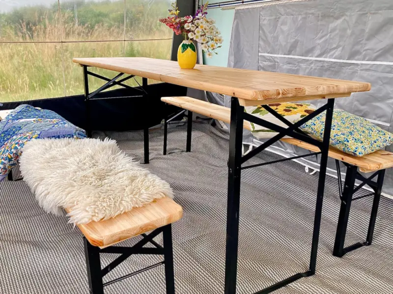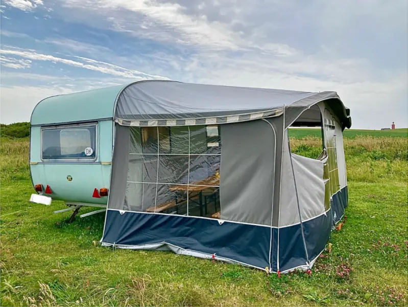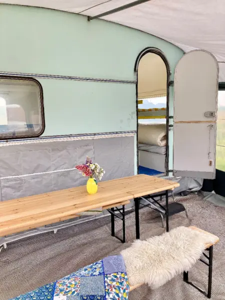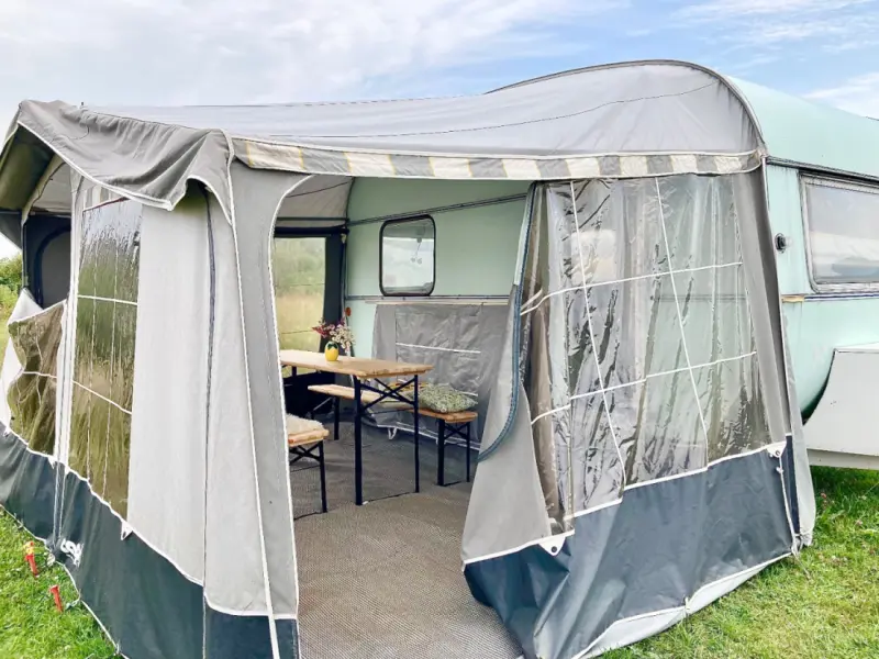 Velkommen til en anderledes campingvogn. En vintage veteranvogn, nænsomt renoveret. Lys og lækker indenfor - og hvis solen ikke skinner på din ferie, gør den det helt sikkert indenfor i denne skønne perle. Den har en stor soveplads i den ene ende, på størrelse med en stor dobbeltseng. To mindre køjer i den anden ende, bedst egnet til børn. Autentisk køkken med køleskab og lille DIY vandsystem, hvor du selv pumper frisk vand op. Helt ny Airfryer sikrer sprøde middage på din ferie! Vognen er vintage, så ting tar tid. Her er der ingen fancy mover eller fixe teltstænger, der rejser sig selv. Det er en del af charmen:)