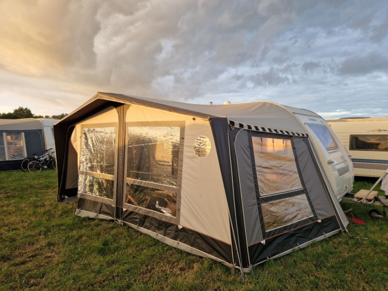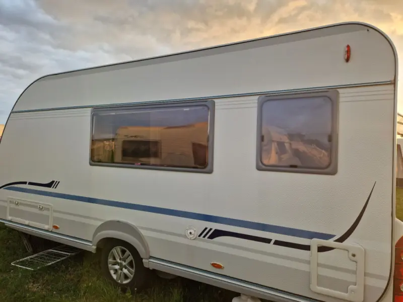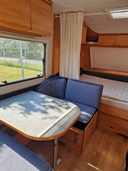Rigtig velholdt, hyggelig vogn med meget naturlig lysindfald (mange vinduer og som alle har myggenet, samt mørklægningsgardiner - Dvs der er mørkt når der skal soves). Flot fortelt, som er forholdsvis nemt at sætte op. Med Mover - så den med fjernbetjening, nemt kan køres til/fra pladsen og til/fra trækkrog. Lille gasgrill, lille bord, stole, cykelstativ mv medfølger. Muligt for flere sovepladser (i fortelt). Lejer tager selv dyner, puder og lagen med. Nem og sikker at køre med (har slingrekobling). Aflevering og/eller afhentning (<1 time fra Horsens) kan evt arrangeres mod merbetaling. Samt evt opsætning/nedtagning.