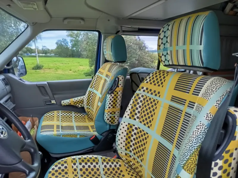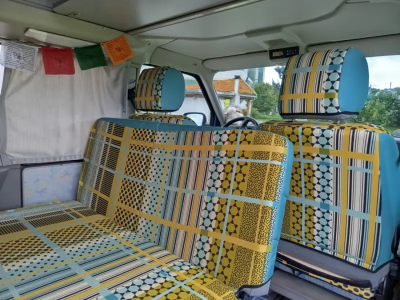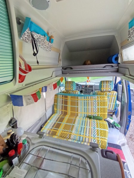 Der Bus lässt sich individuell anpassen... Vorne hinter den Vordersitzen lässt sich ein Tisch für eine gemütliche Sitzgruppe montieren. Oder ein züsätzlich zweites Bett ausziehen.