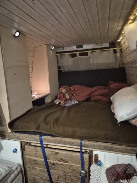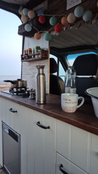Oversæt med Google TranslateGerne vermiete ich meine geliebte "Frida". In ihr hat man genug Platz zum Kochen und Stehen. Kochen ist mit Gas, es hat zwei Herdplatten. Der Kühlschrank ist recht geräumig. Es hat vorne in der "Küche" einen Wasserkanister mit elektronischer Wasserpumpe und hinten im Kofferraum noch einen zweiten Wasserkanister (beide 20 Lieter) Das Bett kann man ausziehen und ist dann 1.30x2m groß. Also zu zweit gut möglich, wenn man gerne kuschelt ;) Es jat eine Trenntoilette; hinten mit Tüte, die man in Mülleimer entsorgen kann und ein Auffangbehälter für den Urin. Kann super gereinigt werden. Ansonsten fährt sich der Bus top und ist ruhig beim Fahren. Am besten gefällt mir immer noch, dass auf beiden Seiten Schiebetüren sind mit jeweils einem großen Fenster :) Es hat ein kleines Vorzelt, welches man extra befestigen kann (als Sonnenschutz) eine Regenschutzmarkise hat es nicht. Allerdings hab ich es nie gebraucht, weil im Bus selbst es so geräumig ist, dass man bei Regrn dort drin super Platz hat. Es hat ein Stromkabel für Landstrom. Und eine Dusch"tüte" in die man wasser einfüllen kann. (Hab ich ehrlich gesagt aber nie benutzt) Ich freu mich wenn die Frida mit dir Abenteuer erlebt :)