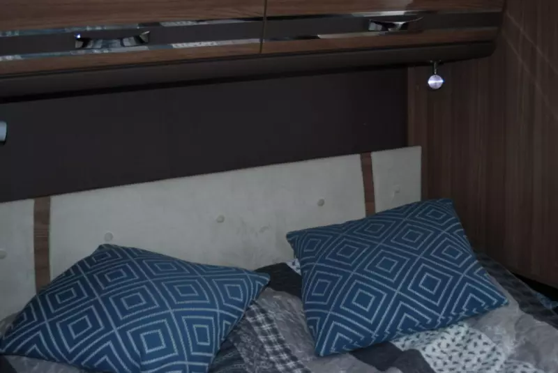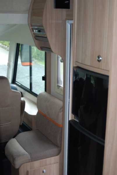 Visa originaltextBilen är möblerad med en våningssäng ovanför förarsätet och en queen size-säng bak. Bilen är utrustad med automatiska stödben. När det gäller möjligheten till en barnstol bör barnet kunna sitta framåt i färdriktningen.