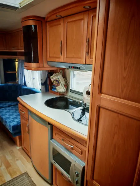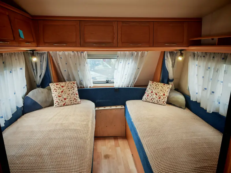 Visa originaltextTvå enkelsängar, en 140 cm bred säng från bordsgruppen, en resesäng för en baby, så den rymmer 4 + 1 övernattning. Madrasser och sängkläder ingår. Väluppfostrade husdjur är tillåtna. Fordon under 1899 kg kan dras med B-körkort, över det krävs BE-körkort. Släpvagnens totalvikt är 1600 kg.