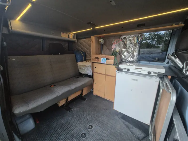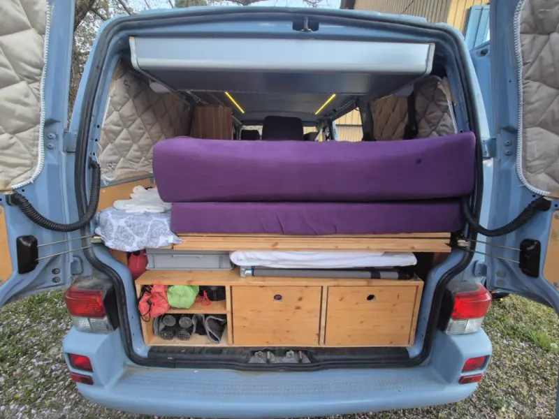 Näytä alkuperäinen tekstiHuomaamaton T4-matkailuauto, joka on rakkaudella käsin muutettu ja täydellinen seuraavaan leirintäseikkailuusi! ... Tässä VW T4:ssä on: - penkki (2 istuinta) - alas taitettava vuode kahdelle hengelle (1,2 x 1,8 metriä) - toinen akku (ladataan ajon aikana tai aurinkoenergialla) - 2 kpl 240 V:n pistorasioita, jotka saavat virtansa toisesta akusta - 2 upotettua LED-nauhaa kattoon sisävalaistusta varten - jääkaappi, joka saa virtansa toisesta akusta - 2-liekkinen kaasuliesi kaasupullolla - keittiövälineet: kattilat, lautaset, aterimet, lasit jne. - 20 litran vesikanisteri - runsaasti säilytystilaa matkatavaroille - lisäeristystyynyt, jotka voidaan kiinnittää ikkunoihin - ei ilmastointia tai keskuslukitusta - retkipöytä ja 2 tuolia - markiisi (pyynnöstä) - riippumatto - aurinkopaneeli (ei kiinteästi asennettu) - aurinkosuihku - pieni työkalupakki - lastensänky ohjaamoon (pyynnöstä)