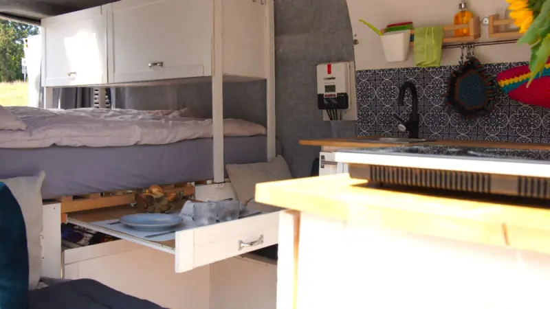 Käännä Google Translate - kääntäjälläFiat-Dangel 4x4 15Q – Autarker Camper mit Solarstrom Dieser individuell umgebaute Fiat-Dangel 4x4 15Q bietet völlige Unabhängigkeit dank einer leistungsstarken Solarstromversorgung. Die gesamte elektrische Ausstattung wird durch drei 160-Watt-Solarpanels, einen MPPT-Laderegler (ML2440, 40A) sowie eine 200Ah Lithium-Batterie betrieben. Ein 2000W-Wechselrichter (12V auf 230V) sorgt für eine zuverlässige Stromversorgung, sodass sämtliche elektrische Geräte problemlos genutzt werden können. Im Innenraum sind drei Dreifach-Steckdosen verbaut, die beispielsweise zum Kochen oder Laden elektronischer Geräte genutzt werden können. Ausstattung im Camper • Elektrische Kühlbox: Mobicool FR60 (Kompressor-Kühlbox, 58 Liter) • Mobile Toilette: Thetford Porta Potti 365 • Gasmelder für erhöhte Sicherheit Vollwertige Küche • Waschbecken mit 12V-Wasserpumpe • Frisch- und Abwassertank (jeweils 30 Liter) • Küchenschränke für Stauraum • Herdplatte und mobiler Backofen Wohn- und Schlafbereich • Fest installiertes Bett (190 cm x 160 cm) • Essbereich mit zwei Sitzen und ausziehbarem Tisch • Geräumiger Stauraum unter dem Bett Zusätzliches Zubehör • Campingtisch • Mobile Campingdusche mit Druck, Duschvorhänge und Bodenplatte • Rako-Boxen für geordneten Stauraum • Wasserkocher Dieser Camper ist ideal für alle, die autark reisen und die Freiheit geniessen möchten, unabhängig von externen Stromquellen.