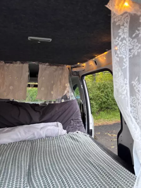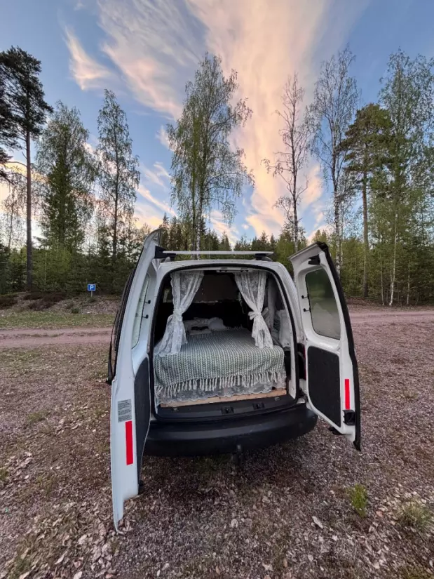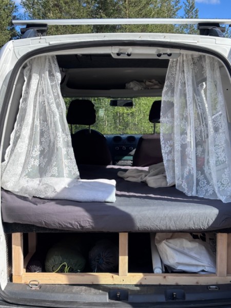 Se originaltekstenLei min perfekte lille perle, en campingvogn for enklere "camping" i sommer. Innebygd seng med en enklere madrass. Massevis av oppbevaringsplass under sengen. Plass til 2 personer. Nydelig og enkelt.