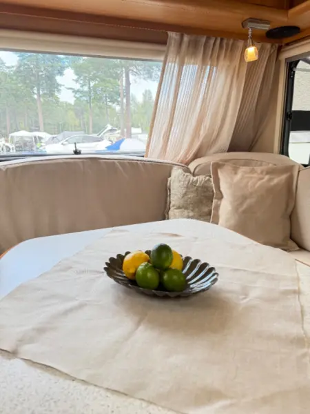 Oversett med Google TranslateAllt ingår, Stolar, bord, Kuddar, täcken, glas, bestick, tallrikar, skålar osv