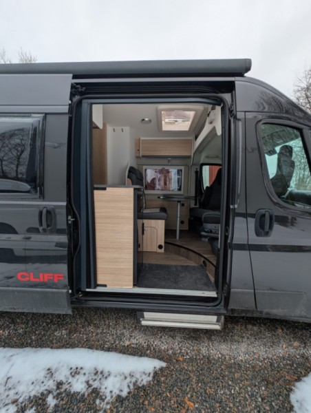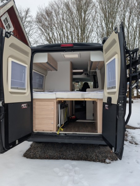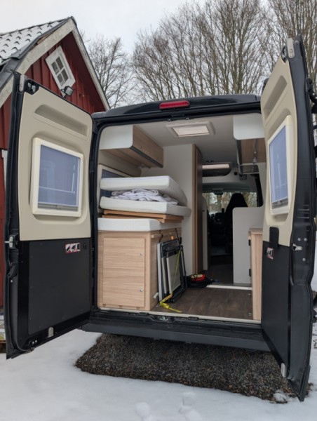 Parkering kan ordnas Solcellerna producerar tillräckligt för att klara sig "off grid" så man är inte lika beroende av laddplatser Två stora tuber gasol för värme, spis och varmvatten