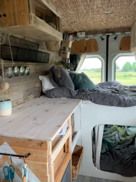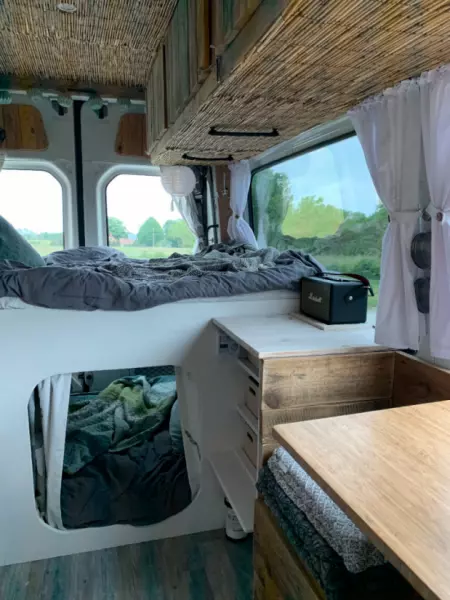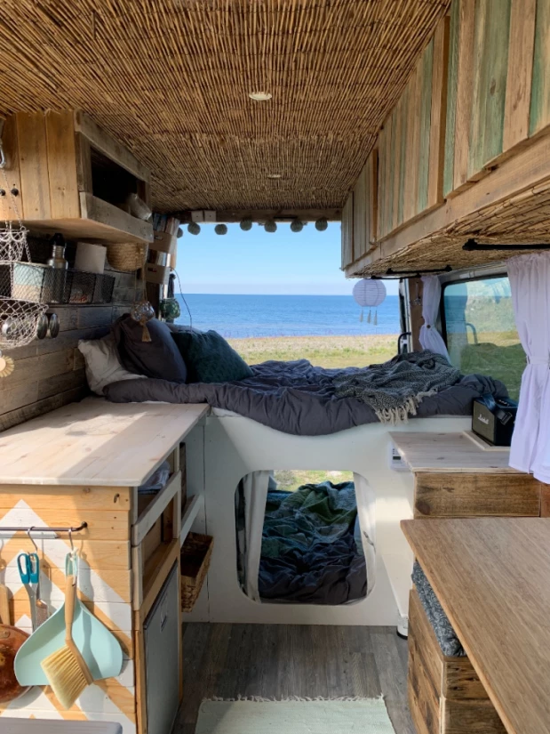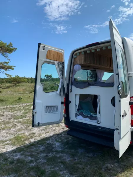 Välkommen att hyra vår pärla! En egenbyggd van med charm och personlighet. Bältade sittplatser finns för fyra personer, plus en obältad bakvänd plats. Airbagen på passagerarplatsen fram är urkopplad för placering av barnstol. Två vuxna (som tycker om varandra) sover bra uppe och två barn kan mysa nere i kojan. Sängarna är ca 110x180 cm. Vi lagar mat ute på gaskök som drivs av engångsbehållare med butangas. Behållare sitter i köket men vi kan inte garantera att gasen räcker, så vi rekommenderar att köpa med sig egen gas från exempelvis Jula. Färskvatten finns i 10-litersdunk med fotpump och används mest till handtvätt (ej dricksvatten), diska brukar vi göra vid strandkanten. Observera att det inte finns någon toalett i vår van. Fråga så delar vi gärna med oss av våra smultronställen på ön. Flexibel in- och utcheckning!