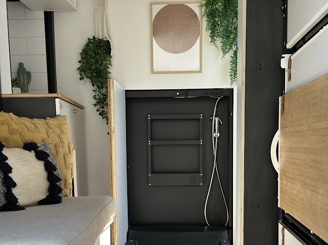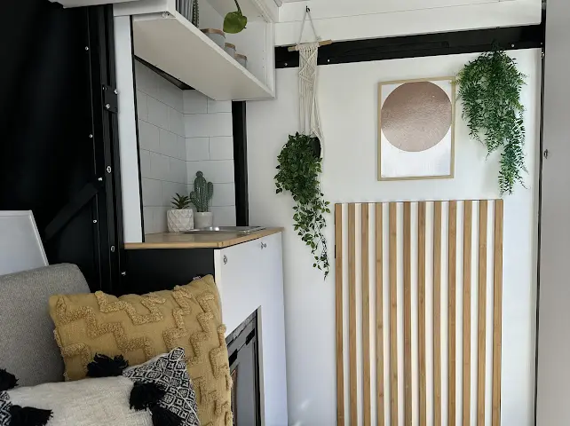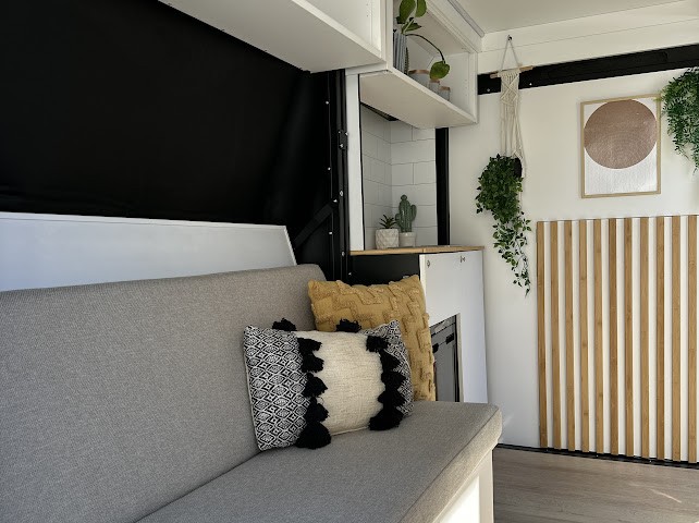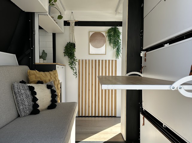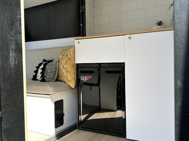 Den har en varmvattendusch inuti, toalett, en bäddsoffa för två personer, ett bord, gott om förvaringsutrymme, ett extrabatteri, ett kök, ett handfat och ett kylskåp.