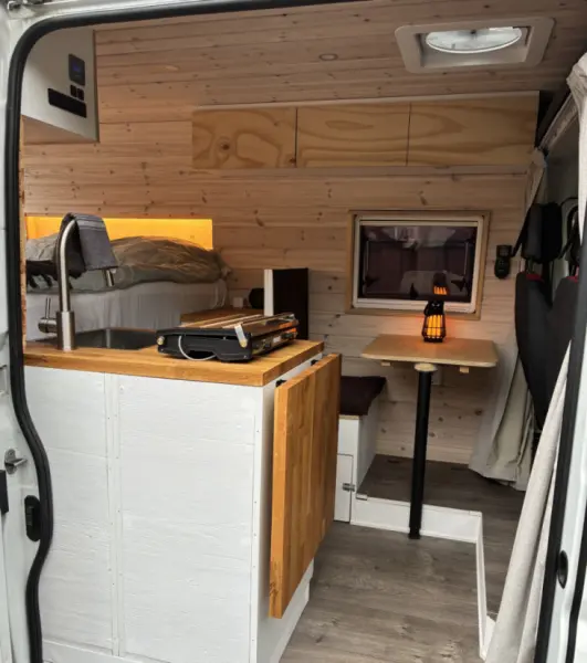Fiat Ducato från 2013. Egen byggd campervan som är omgjord till en husbil. Vanen är smart byggd för att maximera utrymmet. Förare och passagerar sätena går att snurra och sängen är rymliga 140 cm bred och cirka 190 cm lång. Det finns alltså kök, bekväm bordssitts och en stor skön säng. Vanen har ett 150a lithium batteri, vilket laddas genom solceller, laddkabel eller alternativt via dc-dc charger. När solen är ute, behöver man nästan aldrig ladda battiet på många dagar, vilket är väldigt bekvämt. Detta batteri ger el till spotlights i taket, led slingor vid sängen, 48 L kylskåp, vattenpump, 230 v kontaktuttag för laddning av mobil, laptops med mera. Det som är skönt med denna storlek av van är att den får plats på vanliga parkeringar på ICA eller liknande, så du alltid kan ställa dig var du än är. Till exempel om du står på en camping, kan du smidigt ta vanen till ICA och tillbaka till campingplatsen. Vid varma dagar så har vanen 2 öppningsbara fönster och vindavledare på varje sidorutor vid förarhytten, så du alltid kan ha fönstrena öppna där också utan att det regnar in, vilket skapar ett skönt drag. Det finns även en tyst och stark takfläkt som kan blåsa ut eller in luft i vanen.