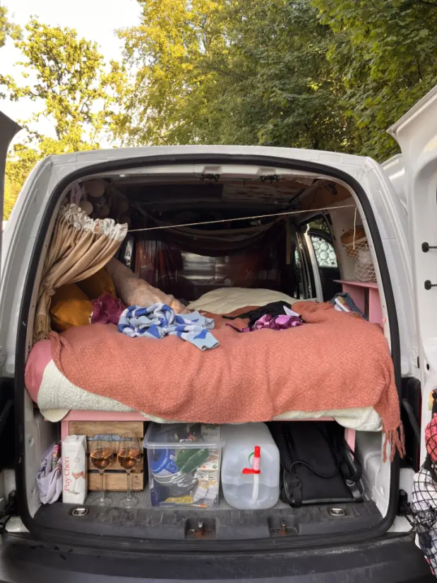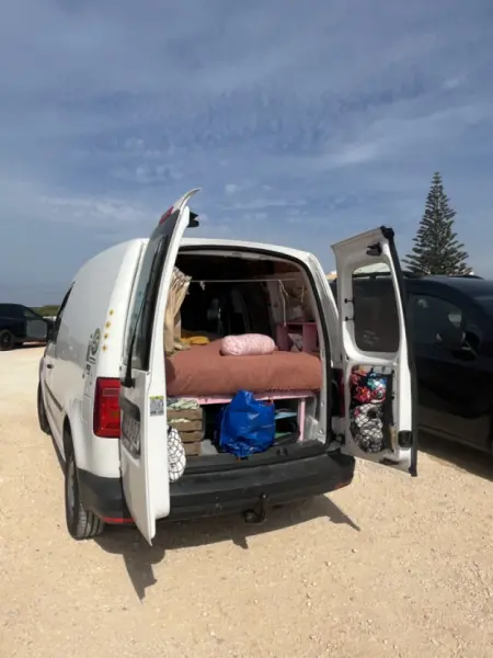 Vattendunk. Solljus-laddad ljusslinga. Ventilation (också solljusladdad). Utrymme i tak, på bakdörrar samt under sängen för eventuella kläder, surfbräda, snowboard, annat. Matprylar så som bestick, skärbräda, tallrikar, glas finnes. Sängkläder bestäms om jag eller Ni/Du står för.