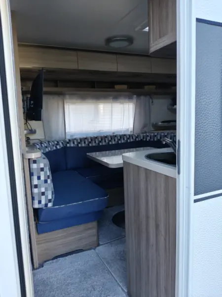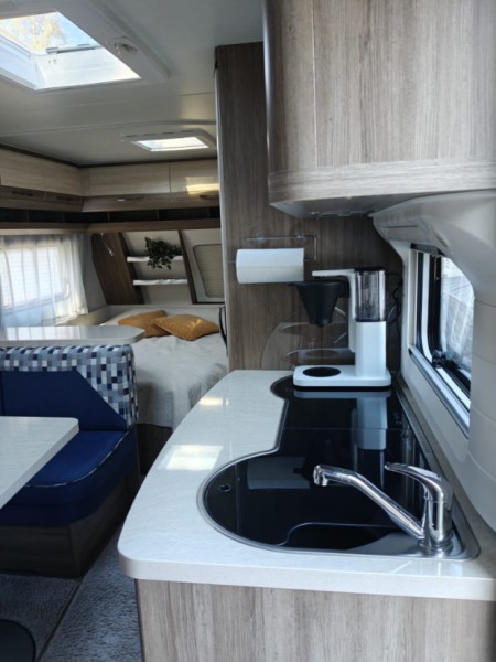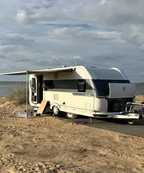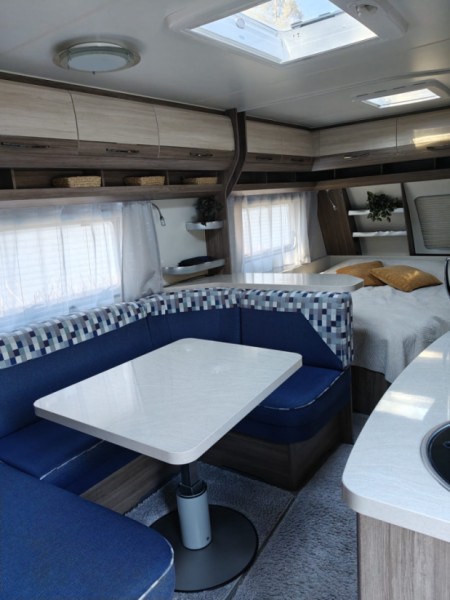 Visa originaltextDen rymliga och funktionella Hobby 560 KMFe erbjuder en bekväm miljö för en semester även för en större grupp. Husvagnen har en dubbelsäng, våningssängar och en omvandlingsbar matplats – sovplatser för flera personer. Kök, toalett och värme gör resan bekymmersfri i alla väder. Husvagnen är idealisk för både weekendresor och längre semestrar. Lätt att använda även för förstagångsanvändare – du får tydliga instruktioner om det behövs. 👍