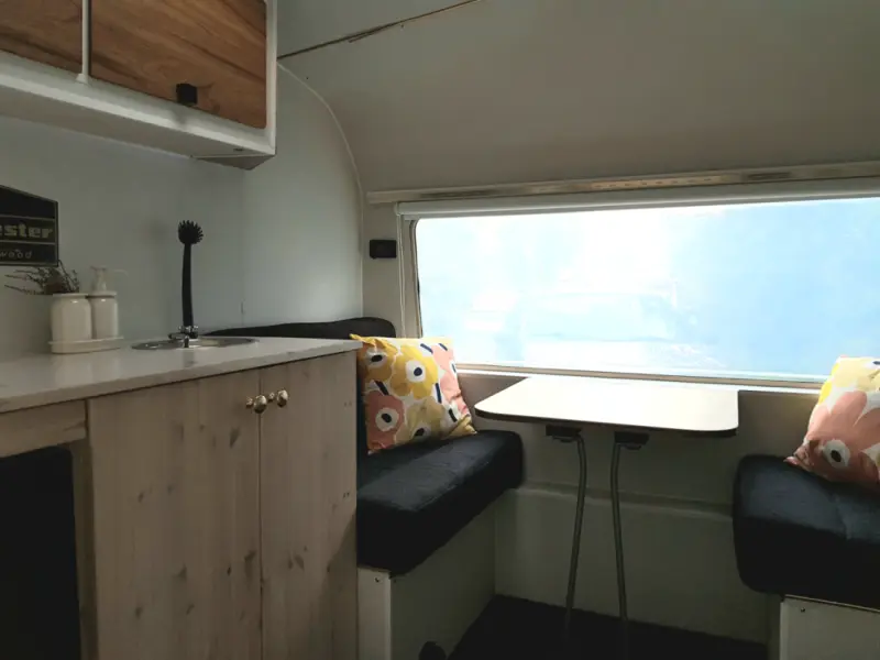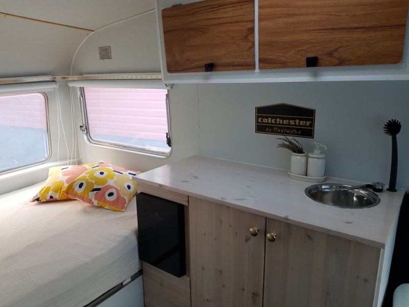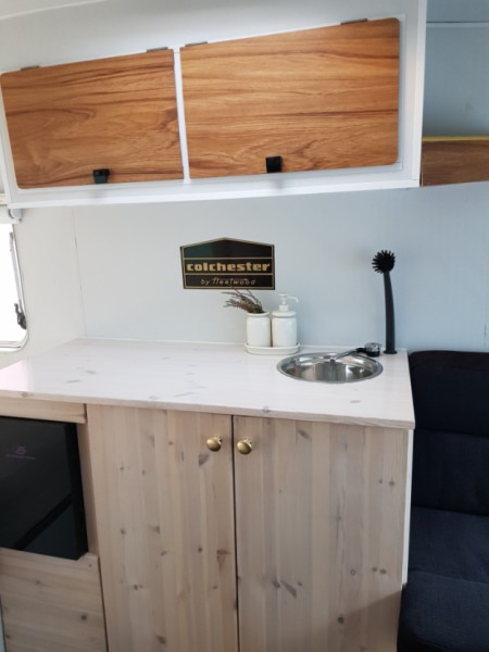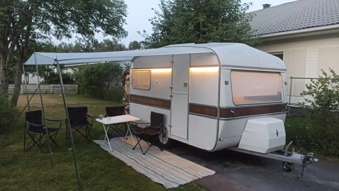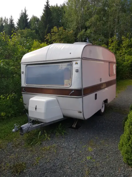 Visa originaltextEn helt renoverad retrohusvagn för två personer eller ett par och ett barn. Denna husvagn är så liten och lätt att den kan dras av nästan vilken bil som helst, och den tillåtna hastigheten är 100 km/h.