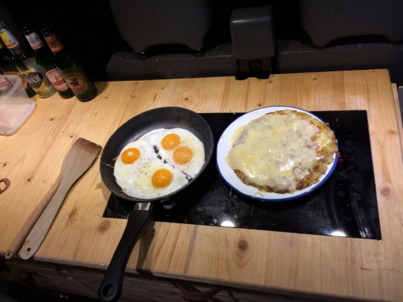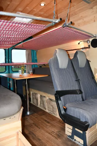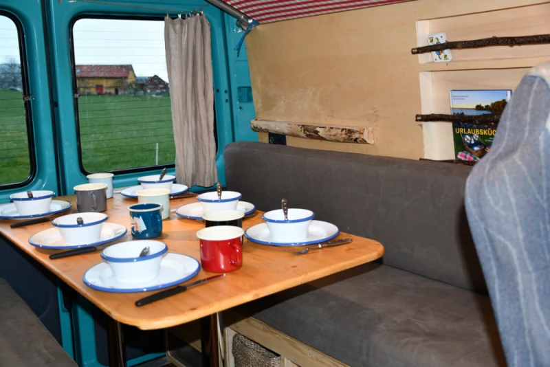 Visa originaltextUrsprung: Våra krav för vår husbil var sov- och sittplatser för tre barn och två vuxna, och helst skulle varje barn ha en egen säng. Efter att ha besökt husvagnsmässan i Bern stod det snabbt klart att vanliga husbilar var för stora för oss. Dessutom fanns det inte en enda skåpbil som erbjöd de fem sovplatserna som krävdes och, viktigast av allt, säten med säkerhetsbälten. Vid den tidpunkten visste vi att vi var tvungna att bygga en själva. Vår Charly var ursprungligen en 15-sitsig. De onödiga sätena togs bort, fönstren täcktes, väggarna isolerades med fårull, elsystemet installerades och vardagsrummet och köket specialbyggdes. Funktioner: Vi utrustade Charly för att passa våra behov med tre barn. Föräldrarnas säng kan omvandlas till ett bord under dagen, där alla fem bekvämt kan sitta. Varje barn har en egen säng, och bordet behöver inte demonteras innan de små går och lägger sig. Barnsängar: Man kan tänka sig dem som tältsängar. Vi sydde fast tyg på en metallram. Våningssängar i sovområdet (2x): 165x60cm Sovområdet bak tvärs (1x): 150x50cm Föräldrasängar: Dessa är gjorda av en enda madrass. Under dagen fungerar sektionerna som sittdynor; på natten är de sammanfogade till en madrass. Enligt vår mening är springorna inte märkbara, eftersom de enskilda sektionerna är tätt komprimerade av sidoväggarna. Sovområde för föräldrar: 180x172cm Under bänken finns sex korgar; varje person får en för sina kläder, och den sjätte fungerar som tvättkorg. Under dagen fungerar barnsängarna som förvaringsutrymme för sovsäckar, kuddar, pyjamas och allt annat som inte behövs under dagen. Det finns också gott om förvaringsutrymme under förarsätena, i bokhyllan och ovanför förarhytten. Om det är möjligt att ansluta bussen till elnätet kan du laga mat på den integrerade induktionshällen. När bussen är ansluten till elnätet drivs lamporna och USB-uttagen av fritidsbatteriet, och vi använder spritköket med två brännare för matlagning. Vid kallt väder är det möjligt att värma bussen med en energieffektiv varmluftsvärmare. Detta är dock bara möjligt om den är ansluten till ett strömuttag.