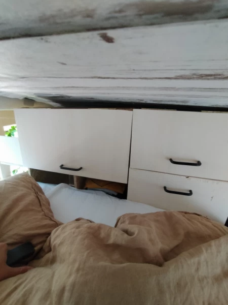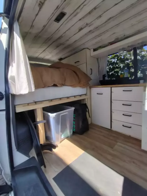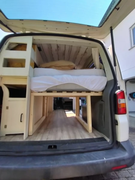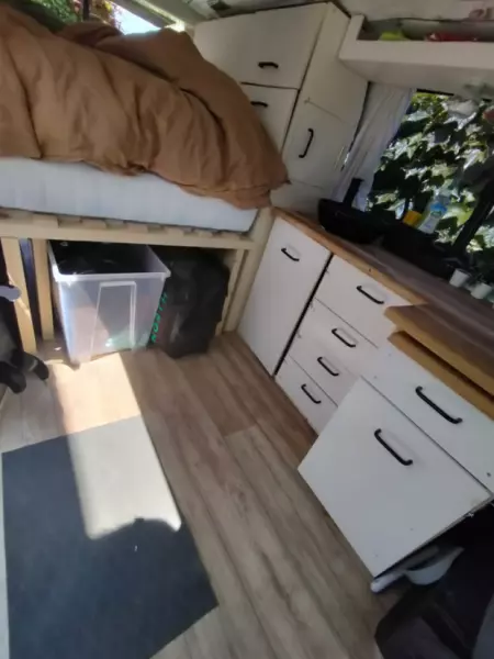 The camper is designed with ample storage space under the bed for sports equipment. Clothes and toiletries can be stored in the wardrobe. With the passenger seat swiveled (swivel base installed) and the extendable table pulled out, it's perfect for cooking or working. A composting toilet can also be installed upon request; with a cushion, it doubles as a stool. :D