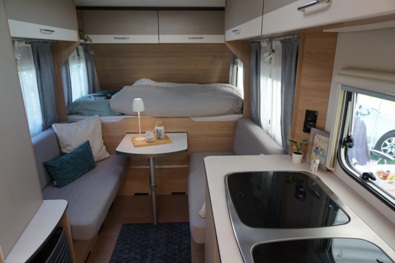 View original textPerfect family caravan with four fixed sleeping berths (1 double bed 160x200 cm, two narrow single beds as bunk beds in the rear (max. 80 kg load each)). Two additional children's sleeping berths are possible by converting the seating area/table into a bed. Rental conditions: flexible cancellation (see conditions below). Minimum stay 3 nights. Long-term discount from the 8th night. Surcharge for short bookings of less than one week. Handover fee: one-time charge of €100. IMPORTANT: Caravan requires an external power supply. No battery is included. The refrigerator only works with electricity (NOT with gas). Therefore, it is not suitable for off-grid camping. Length including drawbar: 715 cm; caravan length: 600 cm. Maximum payload: 400 kg (car/towing vehicle must be rated for a minimum towing capacity of 1400 kg). Large refrigerator with freezer compartment, kitchen with gas stove, toilet with small sink, gas heating. Awning on all sides. Closed. The inventory includes: - Side mirrors for the towing vehicle - Bicycle rack for two bicycles on the drawbar - Table with five chairs for outdoor use - Two sun loungers - Fully equipped kitchen with three gas burners - Coffee maker or Bialetti - Separate gas grill with pizza stone - Small storage unit for outdoor use - Two parasols, shade net - Tools, water can, power cable - SUP (additional €50 per stay) Pillows and duvets must be brought by the guests. Upon booking, we will send you an inventory list and packing list so you have everything you need for a carefree holiday. New vehicle, 2023 model, purchased by us in autumn 2023