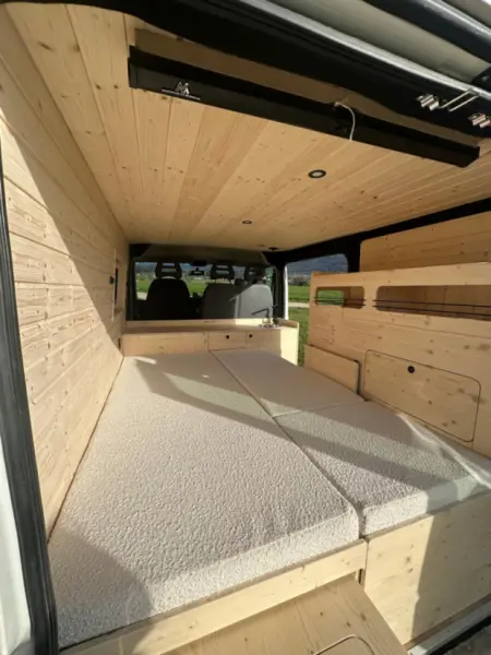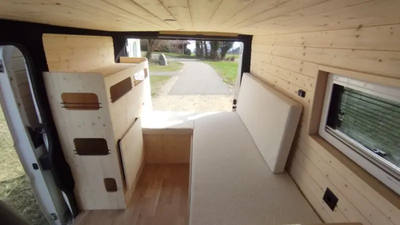 View original text🚐 Cozy campervan – freedom & independence guaranteed! Embark on an adventure with this newly converted campervan, combining comfort, practicality, and natural charm thanks to its warm wood interior 🌲 ✨ A cozy haven: Enjoy a large, comfortable bed (198 x 140 cm), perfect for restful nights after your days of exploring. An interior dining table allows you to savor your meals in peace and quiet. 🔋 Autonomy & Freedom: Travel without constraints thanks to a high-performance electrical system: Lithium battery 425W solar panel 12V and 230V (500W) outlets Ideal for off-the-beaten-path getaways 🌄 🍳 Practical Kitchen Sink with faucet 30L water tank 30L refrigerator Exterior drawer with stove for outdoor cooking 🧳 Functional & Thoughtful Multiple storage compartments to optimize space Camping table and chairs included for enjoying the outdoors 🌿 The Vanlife Spirit: Whether for a weekend getaway or an extended road trip, this van is designed to offer you freedom, simplicity, and comfort, wherever you go.