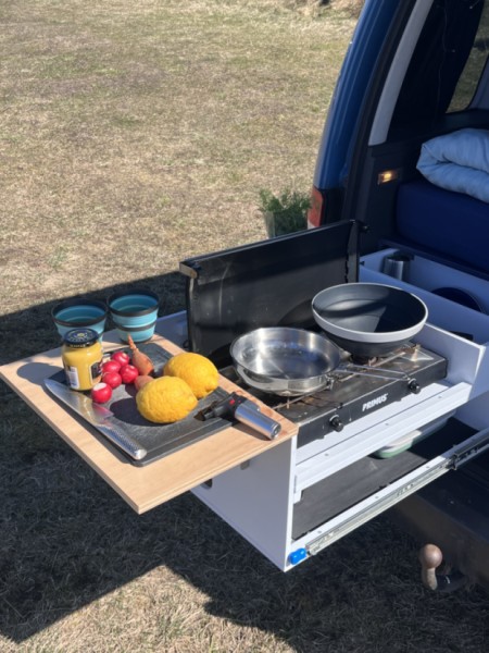 Translate with Google Translate* Anker Solix 330W / 230V power station * Mobicool 15L compressor cooler * 12V USB and USB-C outlets * 1200W lithium battery with DC-DC charging (enough power for at least 24 hours without driving) * Primus 2-burner gas stove * Option to purchase 2 or more 450g gas canisters * Fully equipped kitchen (2 Primus pots, 1 Primus pan, knives, kitchen utensils, cutting board, and everything you need for great cooking) * Dishwashing kit * Option for 12L water storage * 1 table and 2 chairs * Plenty of storage options in either a wooden drawer or external boxes * Fatboy lamp and small lights * Adjustable bed backrest * Big hammock