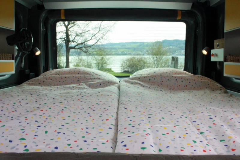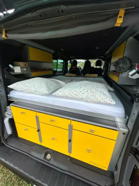 View original textOur campervan is compact, maneuverable, and a real pleasure to drive. Ideal for spontaneous trips. We're a family who rent out our campervan with a lot of heart, and we're happy if you also have an unforgettable time. The campervan has everything you need for a cozy getaway: A 140cm wide bed with a super comfortable mattress for a restful sleep. In the rear, there's a practical kitchen, solar power ensures you remain independent, and cozy LED lights on the ceiling create the perfect ambiance in the evenings. On cool days or nights, a heater provides comfortable warmth, perfect for little winter adventures!