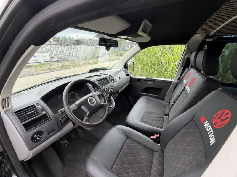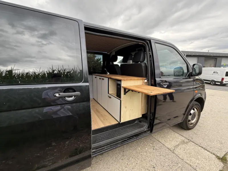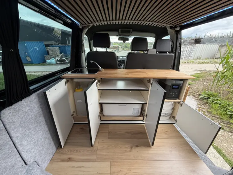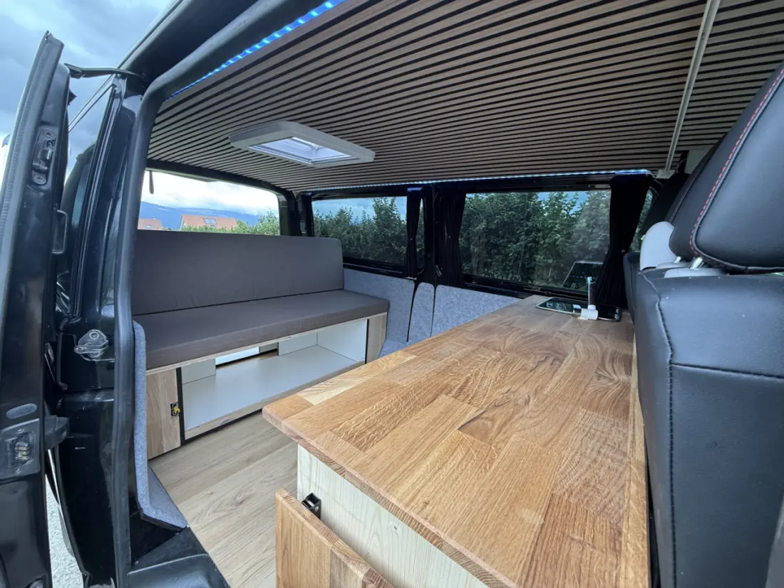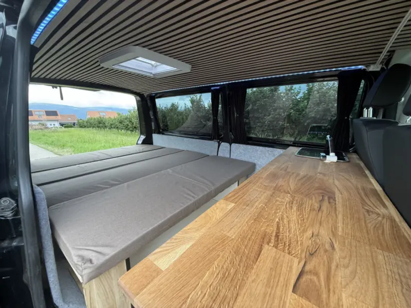 Petit Van Aménagé, quatre places, avec quatre places assises en mode route et quatre couchages grâce à la tente de toit.