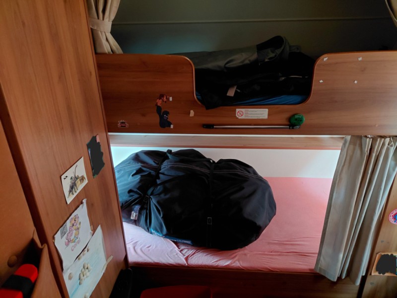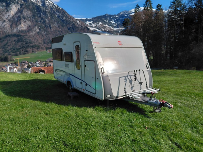 View original textHeating (gas) Air conditioning (electric cooling/heating) Toilet Kitchen with 3 gas burners. Refrigerator (electric car/cable) Bunk bed at the front (90cm lower, 80cm rounded upper) Drop-down bed 140cm above seating area Bike racks (3x) Small garage (when lower bunk bed is folded up)
