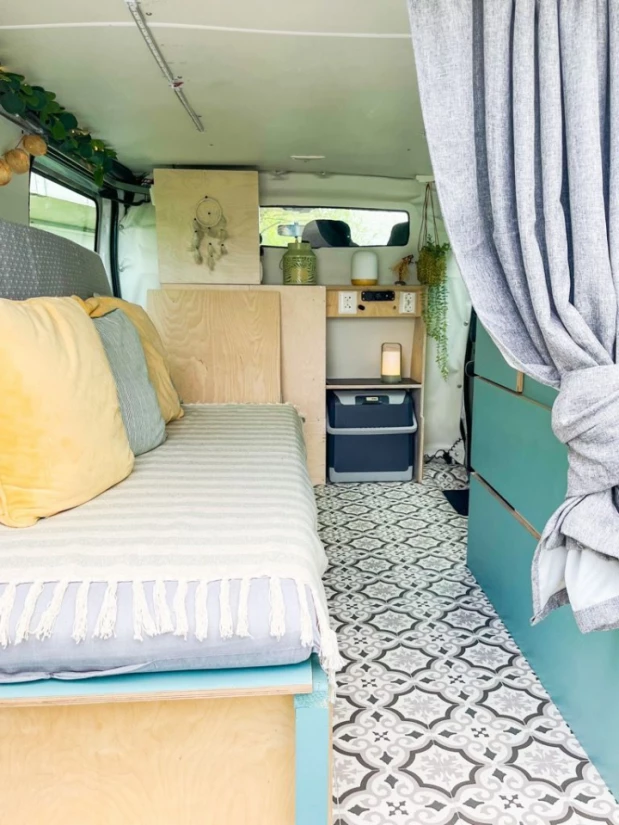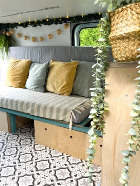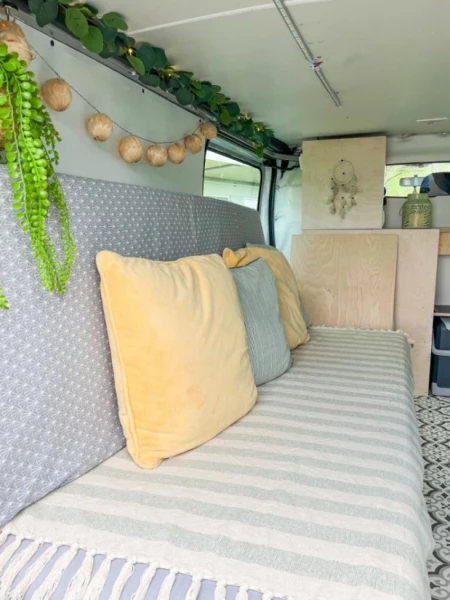 View original textSimple but charming campervan for rent. Good and comfortable sofa that with the help of some sheets becomes a comfortable bed for two people with a width of about 135cm. Equipped with the most essential things you need on a trip. Cups and dishes, cooking equipment and camping chairs for outdoor relaxation to name a few. With its 520 cm length, it fits in standard parking spaces, which is good when moving around. We are very happy with our car and have had many great trips. Now we are thinking of lending it out a bit from time to time and hope others will also take it on adventures and have good experiences with nice company and a charming car.